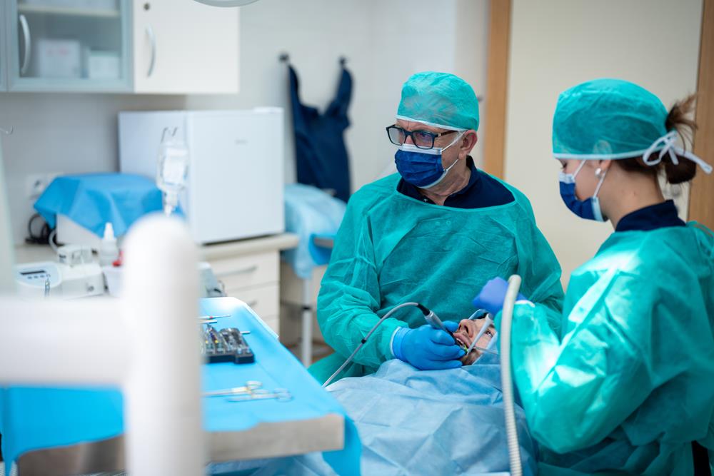 Do zabiegów chirurgii stomatologicznej należą m.in. usuwanie zębów, usuwanie zębów zatrzymanych /tzw. dłutowanie/, resekcja /usuwanie wierzchołków korzeni z powodu zmian zapalnych, z jednoczesnym pozostawieniem zęba/, zabiegi korekcyjne na tkankach miękkich /plastyki dziąseł w przypadku obnażenia korzeni, podcinanie wędzidełka wargi górnej lub wędzidełka języka itp./ W zakres chirurgii stomatologicznej zalicza się także zabiegi mające na celu poprawę stanu tkanek – przed zakładaniem implantów lub wykonywane jednocześnie z implantacją. Do takich zabiegów należą wszelkie zabiegi Sterowanej Regeneracji Kości /GBR – Guided Bone Regeneration/ oraz Sterowanej Regeneracji Tkanek /GTR – Guided Tissue Regeneration/. W tych przypadkach stosowane są różne materiały wspomagające, pochodzenia ludzkiego, zwierzęcego lub syntetyczne, a także różnego rodzaju membrany (tzw. błony zaporowe), najczęściej kolagenowe. W większości zabiegów regeneracji wykorzystujemy także fibrynę bogatopłytkową, pozyskaną z krwi żylnej pacjenta, pobranej bezpośrednio przed zabiegiem. Więcej na ten temat na stronie www.implanty.com.pl